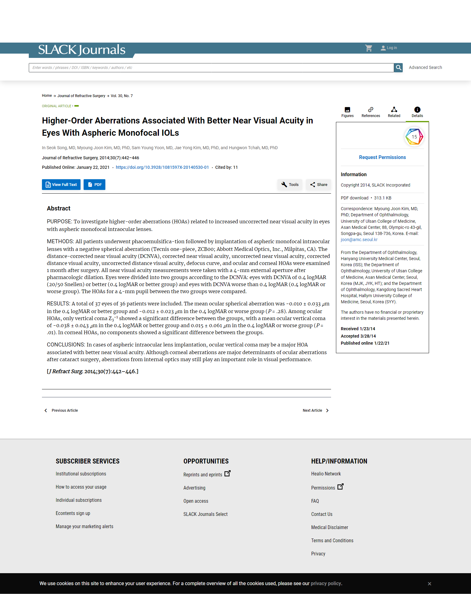 Higher-order aberrations associated with better near visual acuity in eyes with aspheric monofocal IOLs
