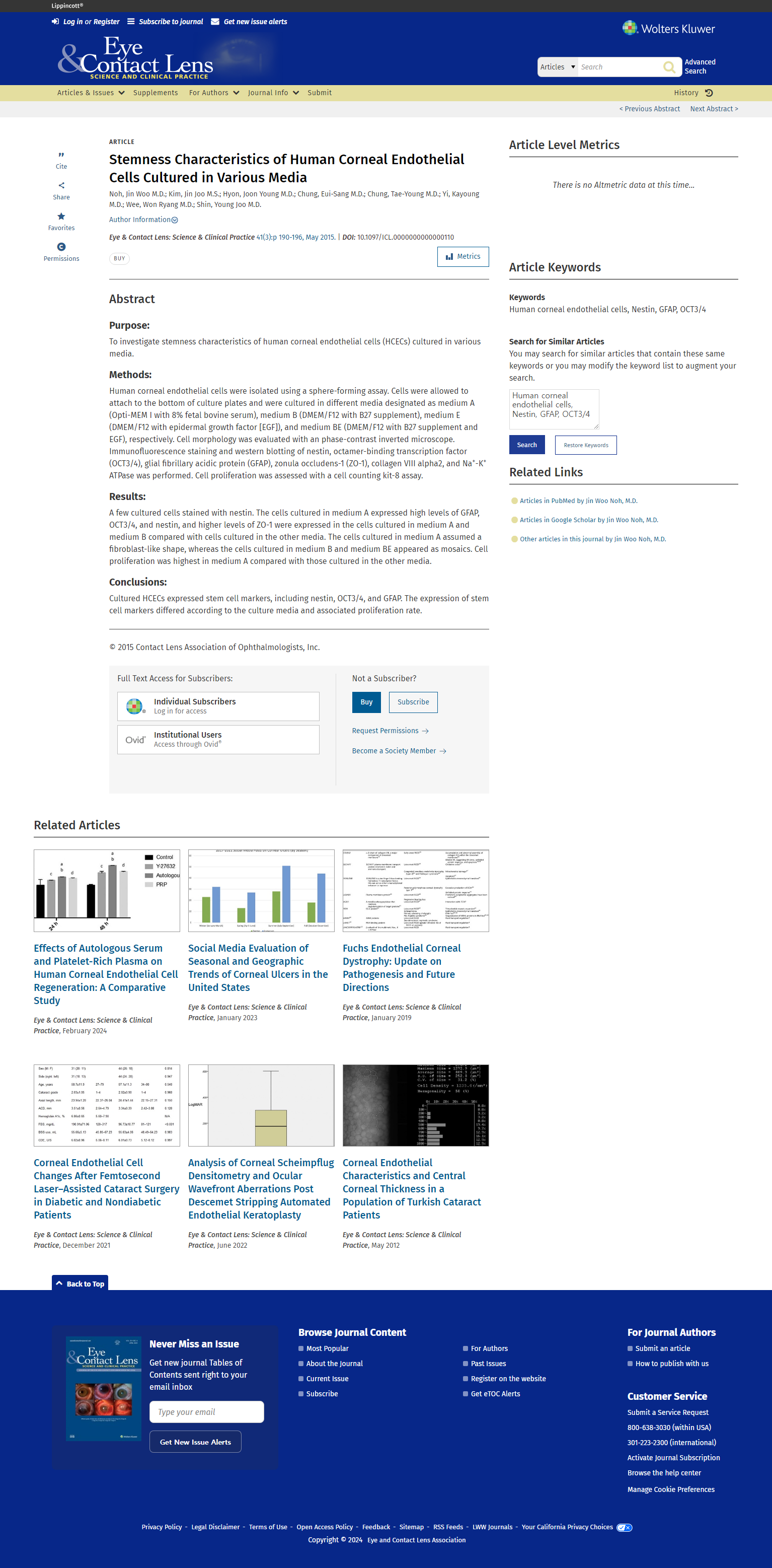 Stemness characteristics of human corneal endothelial cells cultured in various media. Eye Contact Lens
