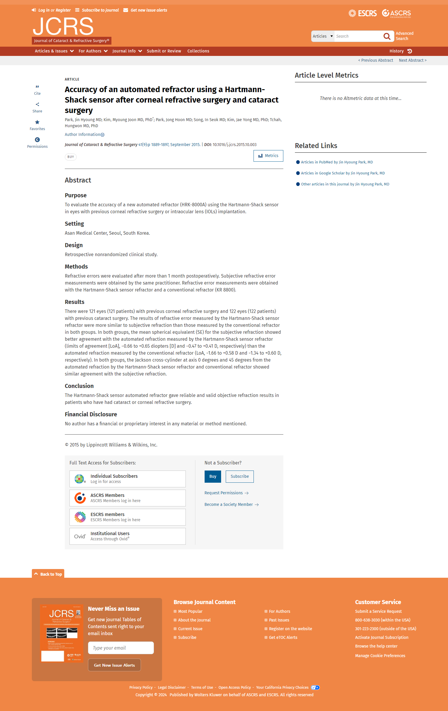 Accuracy of an automated refractor using a Hartmann-Shack sensor after corneal refractive surgery and cataract surgery