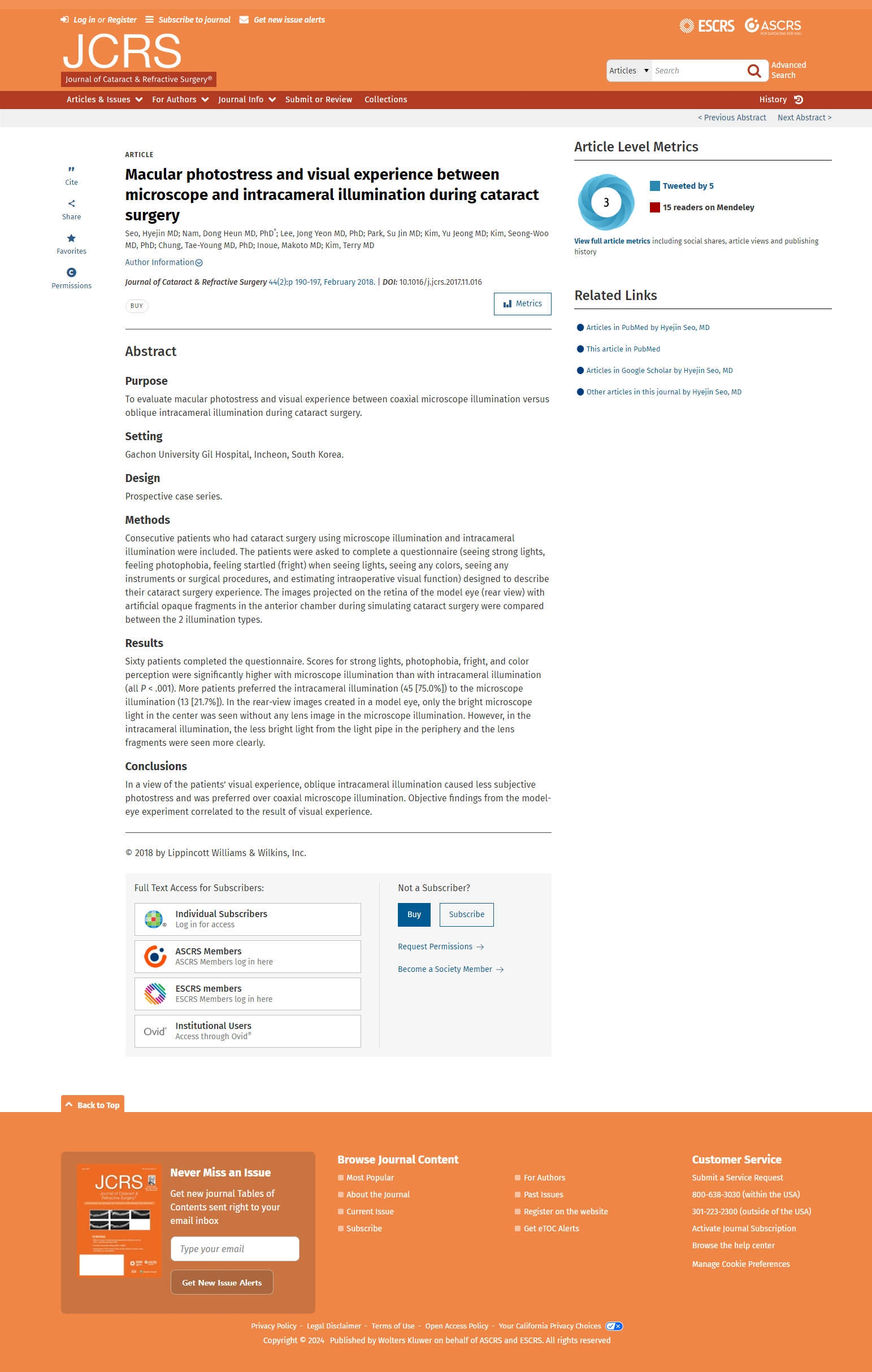 Macular photostress and visual experience between microscope and intracameral illumination during cataract surgery